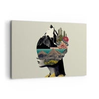 Bild auf Leinwand - Leinwandbild - Collage einer Frau mit Berglandschaft und Blumen - 100x70cm - Frau – bleibt immer ein Geheimnis - Moderne Wanddekoration für Wohnzimmer und Schlafzimmer ARTTOR