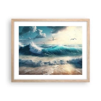 Poster in einem schwarzem Rahmen - Meereswellen am Strand unter blauem Himmel mit Möwen - 100x70cm - Es summt nur für dich - Moderne Wanddekoration für Wohnzimmer und Schlafzimmer ARTTOR