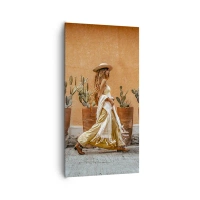 Bild auf Leinwand - Leinwandbild - Eine Frau im Boho-Stil mit Töpfen voller Kakteen im Hintergrund. - 120x50cm - Hippie-Stil - Moderne Wanddekoration für Wohnzimmer und Schlafzimmer ARTTOR