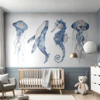 Fototapete Premium Canvas - Quallen, Wale und Seepferdchen im Aquarellstil - 100x70cm - Meereswunder - Moderne Wanddekoration für Wohnzimmer und Schlafzimmer ARTTOR