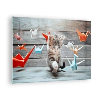 Glasbild - Bild auf glas - Eine Katze spielt mit bunten Origami-Kranichen - 70x50cm - Erste Stunde - Moderne Wanddekoration für Wohnzimmer und Schlafzimmer ARTTOR