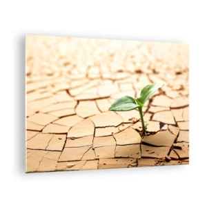 Glasbild - Bild auf glas - Eine junge Pflanze wächst aus trockener, rissiger Erde - 70x50cm - Die unbezähmbare Kraft des Lebens - Moderne Wanddekoration für Wohnzimmer und Schlafzimmer ARTTOR