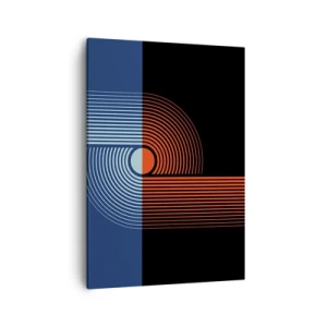 Bild auf Leinwand - Leinwandbild - Geometrische Abstraktion mit Linien in Marineblau und Orange. - 50x70cm - In einer geometrischen Umarmung - Moderne Wanddekoration für Wohnzimmer und Schlafzimmer ARTTOR